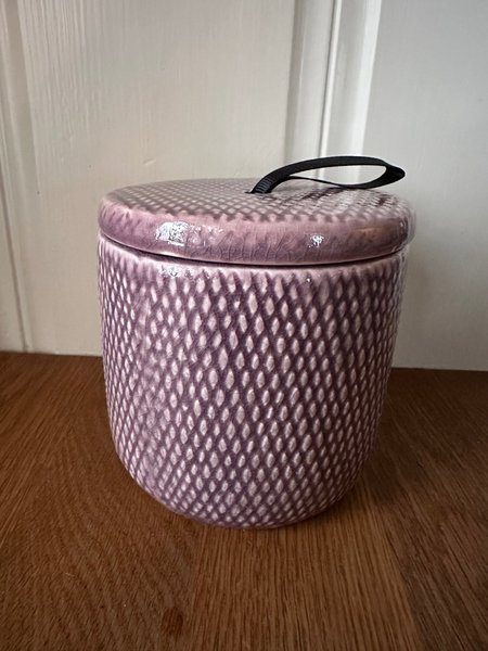 Lila burk i porslin med lock och ett svart band. Mått 11x11 cm. Fint skick, felfri. Lite blänk i bilden pga ljuset.