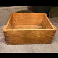 En rustik trälåda med tryck. Perfekt för förvaring eller som en dekorativ detalj i hemmet.