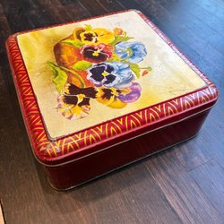 En dekorativ plåtburk med ett vackert blommönster. Perfekt för förvaring av diverse saker.