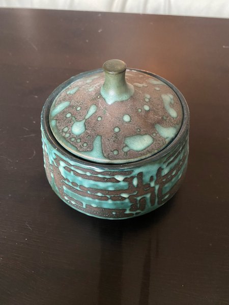 En keramikburk med lock. Burken har ett mönster i turkos och brunt. Höjd 11 cm