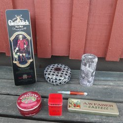 Svarta asken – nyckeln till låset fattas, snidade mönstret bitvis repad, mycket spår av lim på insidan. gångjärnen lite lösa.