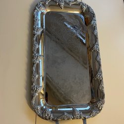 Silverfärgad bricka med handtag. Den har ett dekorativt mönster runt kanten.