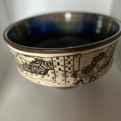 En fin keramikskål med ett unikt mönster. Perfekt för servering eller som en dekorativ detalj i hemmet.