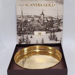 En rund Scandia Present bricka i silverfärg med guldfärgade detaljer. Brickan har en diameter på 30 cm.