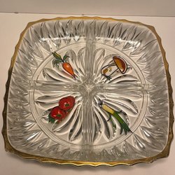 Serveringsfat i glas med flera fack. Perfekt för att servera snacks, godis eller andra tilltugg. Fatet har ett dekorativt mönster.