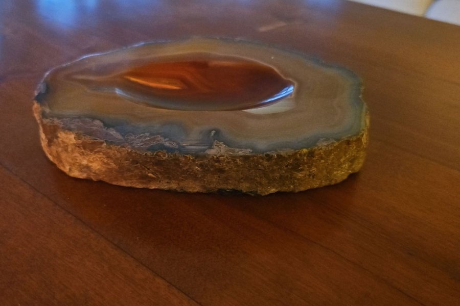 Ett vackert fat i agatgeod. En sten som oftast bryts i Brasilien. Kanterna är lämnade råa. Man kan med fördel använda det till att t.ex.lägga sina smycken i på kvällen. Dimension 15x11 cm.