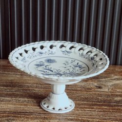 En dekorativ fruktskål på fot. Skålen har ett vackert mönster i beige och grå toner.