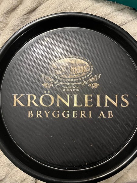 Svart rund bricka med texten ”KRONLEINS BRYGGERI AB” i guld. Brickan har en texturerad yta.
