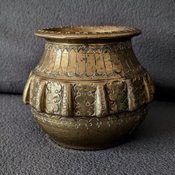 En liten skål i metall med ett detaljerat mönster av blad och druvor. Skålen har en vit metall finish och är dekorerad.