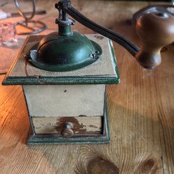 En charmig kaffekvarn med en rustik design. Den har en trälåda och en metallmekanism med ett handtag i trä. Perfekt för den som uppskattar traditionell kaffebryggning.