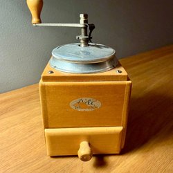 Klassisk antik kaffekvarn med låda. Vi har använt den till att mala vår egenodlade chili i.