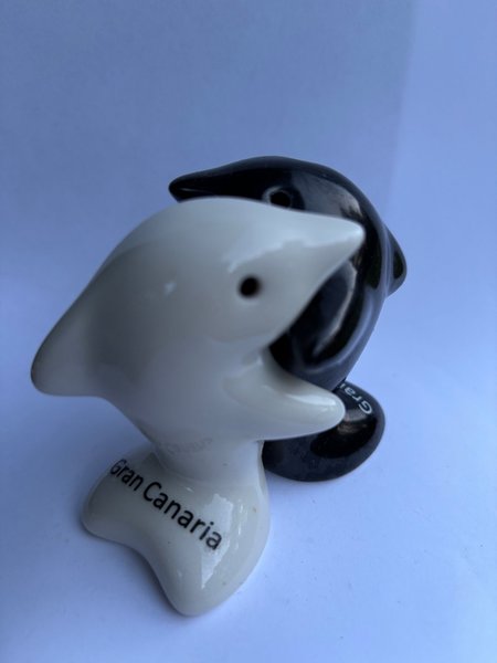 Ett set med salt och pepparkvarn, kramande delfiner i keramik.