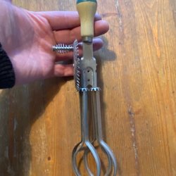Riktigt kul vintage visp i plast med rött handtag. När man trycker handtaget upp och ner så snurrar vispen.