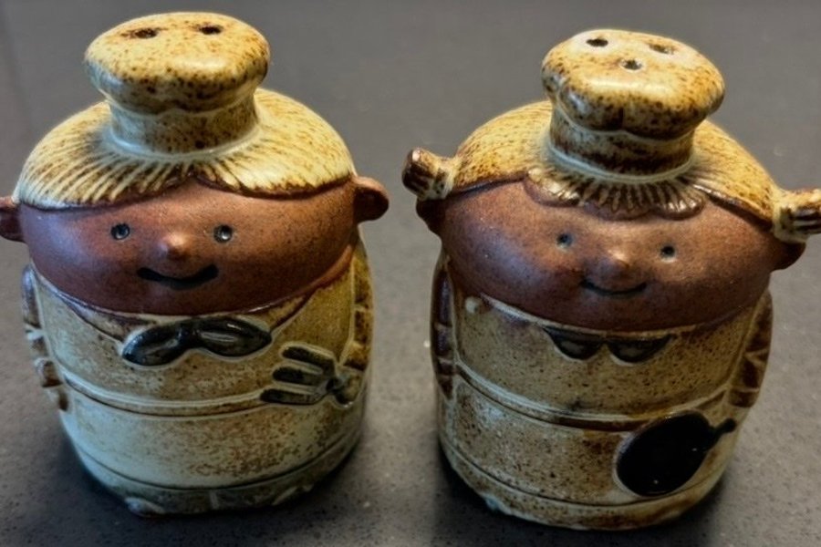 Ett par salt- och pepparströare formade som kockar. De är tillverkade i keramik och har en glaserad yta. Kockarna har detaljer som kockmössor och förkläden.