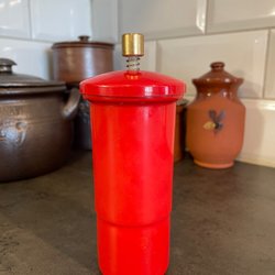 Sockerströare i röd metall, Sockerpullan från NilsJohan. Mycket bra skick, förutom några småmärken på kanten upptill.
