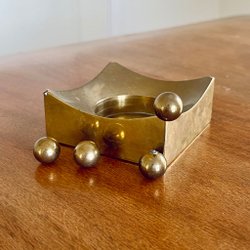 Modernistisk ljuslykta i mässing med mörk bärnstensfärgad glaskupa. Formgiven av belysningskonstnären Hans-Agne Jakobsson under tiden han var verksam vid sin egna ateljé i Markaryd.