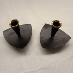 Set med tre ljusstakar i svart metall med detaljer i koppar. Passar lite mindre ljus typ julgransljus. Fint skick.