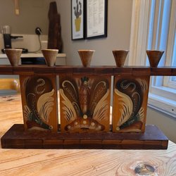 En vacker ljusstake i trä med plats för fem ljus. Den har en fin blomsterdekoration.