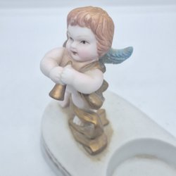 En dekorativ ljusstake med en ängel som spelar harpa.