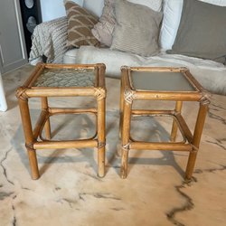 Ett par äldre ljusstakar i mässing. Ljusstakarna har handtag och en dekorativ design. Söta. Trevliga, med fina handtag för de nattliga promenaderna .