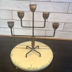En retro ljusstake för fyra ljus. Den har en unik design med svart metall och detaljer i svart och gult.
