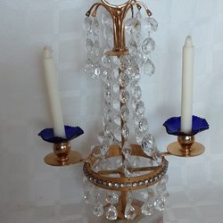 Design: Ljusstaken är behängd med slipade prismor i glas och har plats för två ljus.