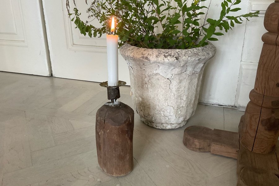 En charmig och rustik ljusstake i trä slutet av 1700-talet som skapar en mysig atmosfär.