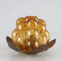 Ljuslykta i bärnstensfärgat glas med bubbelmönster. Lyktan har en guldfärgad botten som jag inte vet om den är orginal men den passar i mått