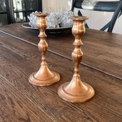 Ett par ljusstakar i malm/mässing. Höjden är 17 cm, diameter 8 cm. Märkta med "MALM".