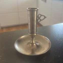 En nattljusstake i tenn med en rund bas och ett handtag på sidan.