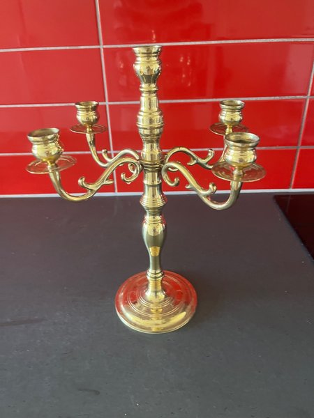 Femarmad ljusstake i guldfinish trettiotre centimeter hög. Pryder festbordet.