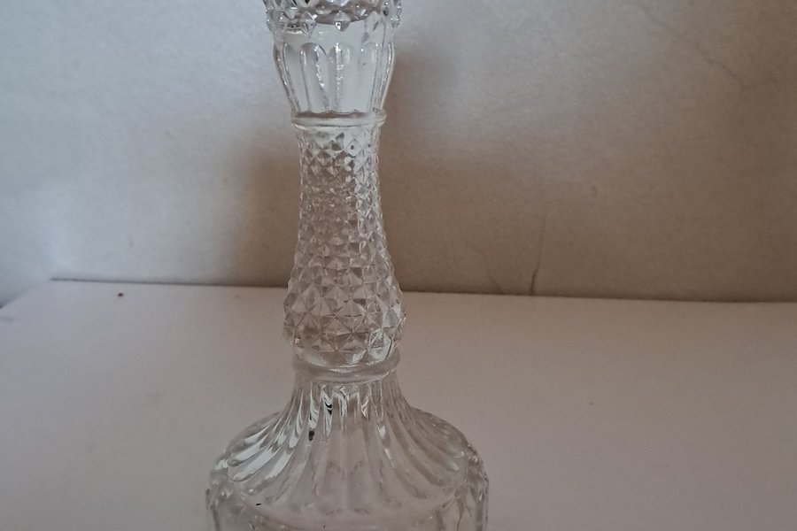 En ljusstake i klarglas med en mönstrad design. Ljusstaken har en räfflad bas och en mönstrad mittsektion som leder upp till en slätare topp.
