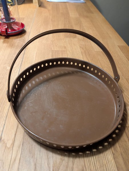 Rund bricka i brun färg. Brickan är försedd med ett handtag och har en perforerad kant.