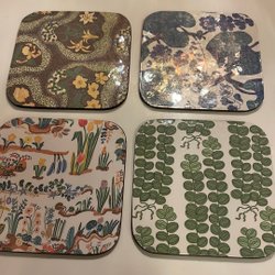 Glasunderlägg med ett blommigt mönster och ett tillhörande ställ.motiv Josef Frank handmade laminerad