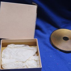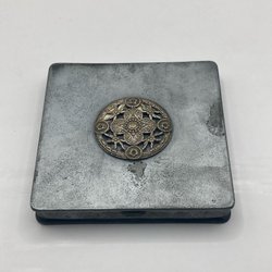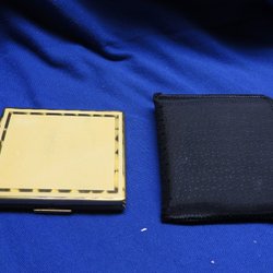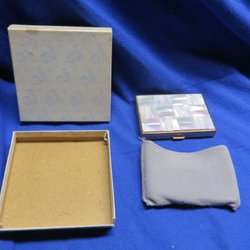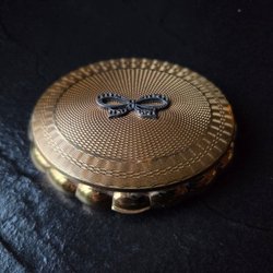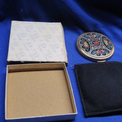En puderdosa med ett motiv av två kvinnor. Dosan är gjord av mässing och har en grön botten. Insidan är klädd i rött tyg.