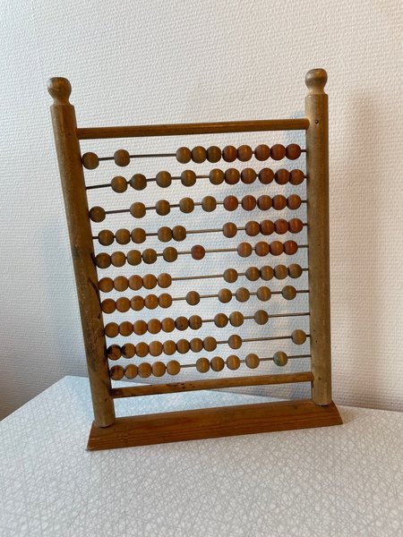 Gammal kulram i trä med tio rader. Varje rad har tio kulor i olika nyanser av brunt och beige. Ramen är tillverkad av ljust trä och har en stabil bas.