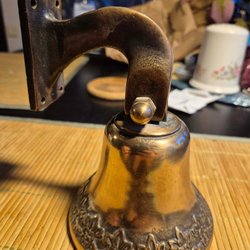 Gammal klocka, med nå text på nederkanten men vet ej vad det står! Tror på ryska! Väger 588 gram, ca 10 cm hög. Hög och fin klang.