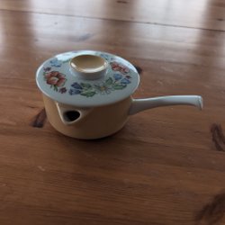 En kanna i ljusblått. Det finns en stämpel under och en ring mitt på