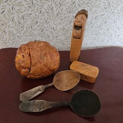 Vintage nötknäppare i gjutjärn, monterat på en bas av trä.