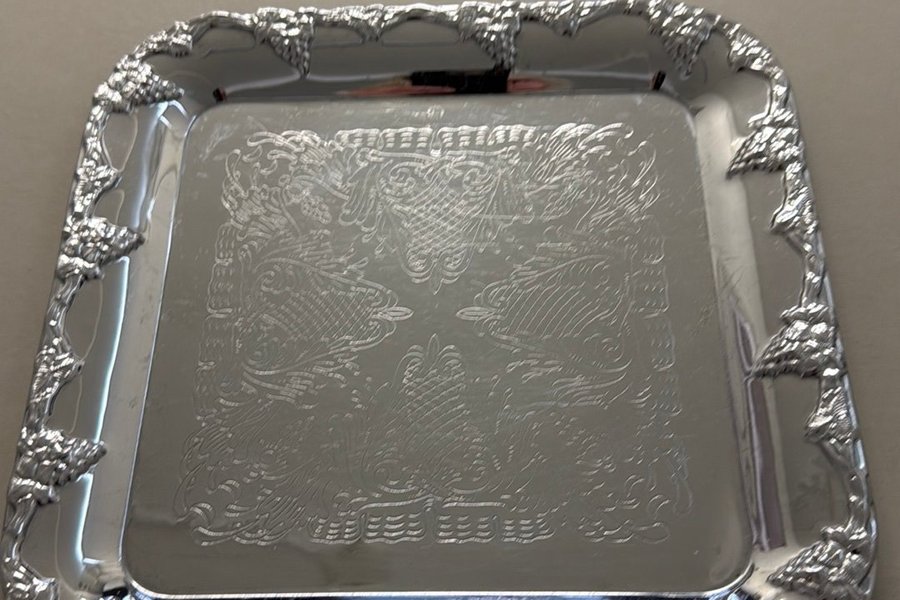 Serveringsbricka i silverfärg med detaljerade mönster. Brickan har en rektangulär form med rundade hörn och en dekorativ kant. 23*23 cm