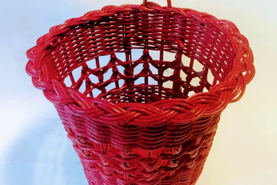 6 stycken röda korgar. Korgarna har en ögla så de går att hänga på väggen. Korgarna är 14 cm höga och 15 cm i diameter.