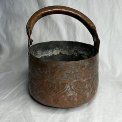 Vackert ytterfoder med patina. Tror det är mässing eller koppar. En tunn plåt är den gjord av och lättviktad. Höjd 17 cm och diametern är 22 cm.