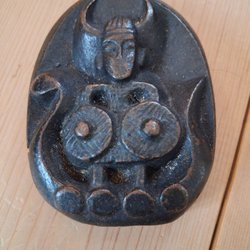 Brevpress/skulptur i gjutjärn med motiv av viking. Baksida signerad "Blomberg" samt märkt "Gåva av Skandinaviska banken".