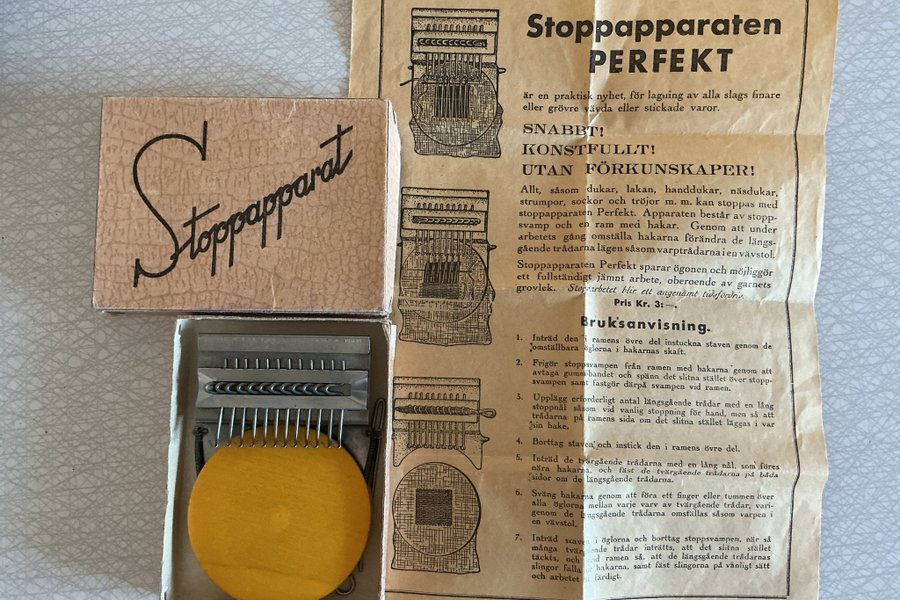 Stoppapparat Perfekt för lagning av vävda eller stickade varor. Apparaten består av en stoppsvamp och en ram med hakar. Den är avsedd för att underlätta stoppning av dukar, lakan, handdukar, näsdukar, strumpor, sockor och tröjor.