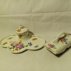 Vintage bläckhorn i kopparfärgad metall med porslins insatser mått ca 17x16 cm
