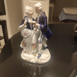 En vacker porslinsfigur föreställande ett dansande par. Figuren är detaljrikt utformad med fina detaljer i blått och guld. 12×11×6cm. Perfekt som prydnad i hemmet eller som en del av en samling.
