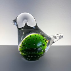 En söt liten fågel i grön glas.