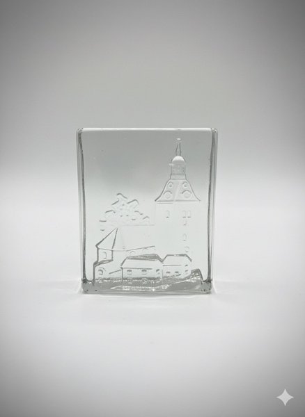 Dekorativt glasblock med ingraverat motiv av byggnader/kyrka.