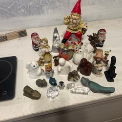 En samling av olika dekorativa figurer. Inkluderar jultomtar, djur och andra figurer. Perfekt för att dekorera hemmet.
