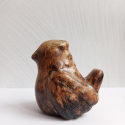 En dekorativ keramikfågel. Den har en brun och svart färg.
